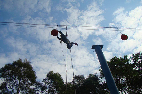 學員爬上7米高的跳臺,在跳臺上奮力跳出拍打汽球。這個項目主要訓練學員克服心理障礙、建立良好的心理素質及自信心,果斷的